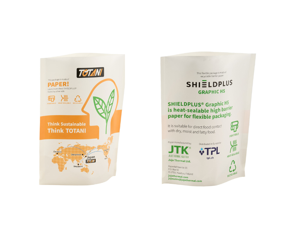 Collaboration of Jujo Thermal and Totani demonstrates the performance of heat sealable and recyclable barrier paper SHIELDPLUS® Graphic HS